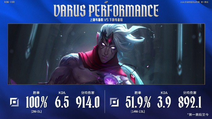 赛事数据:LPL第一赛段至今上单维鲁斯两场100%胜率 下路51.9%