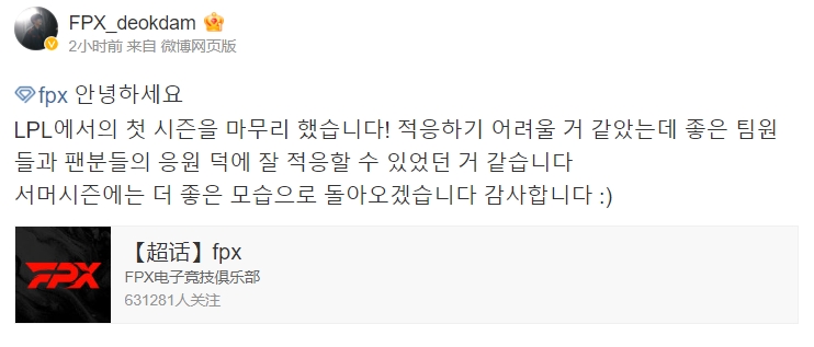deokdam:大家好呀 在LPL的第一个赛季结束啦!虽然适应起来有点困难 但是托很好的队员们还有各位粉丝们的应援的福我才能很好地适应了 夏季赛我会以更好的面貌再次回来的 谢谢大家 :)