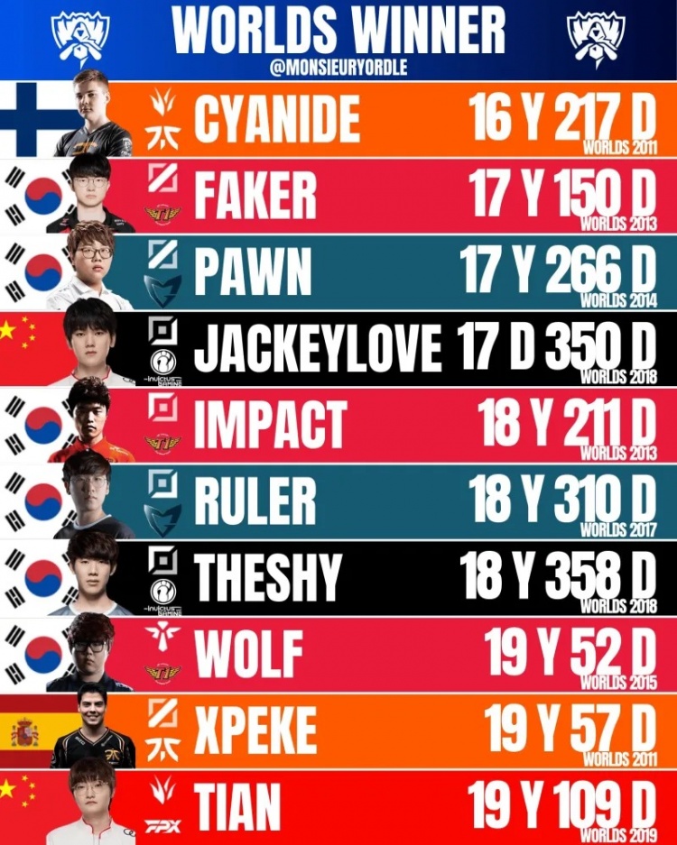 外网数据统计媒体Monsieur Yordle盘点了世界赛夺冠的最年轻选手TOP10。