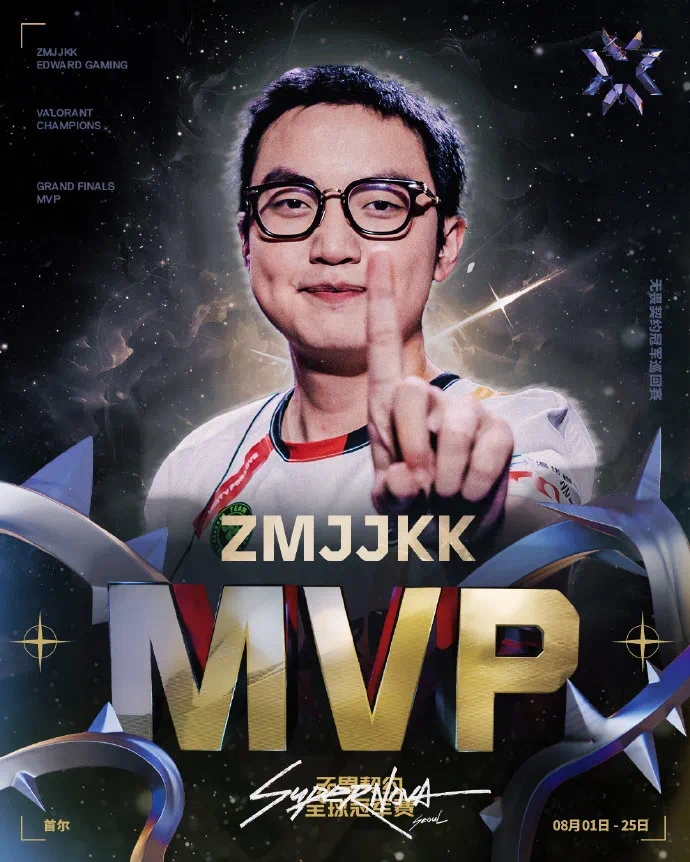 EDG的选手ZmjjKK(郑永康)也凭借决赛期间优异的表现获得2024无畏契约全球冠军赛MVP!