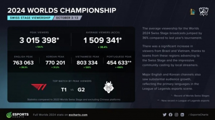 本次世界赛瑞士轮阶段平均观众人数达到了1509341,与2023年全球总决赛相比上升了36.4%;